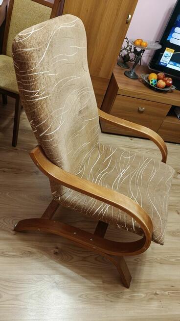 Fotel z drewnianą podstawą, z tapicerowanym siedziskiem. Do obejrzenia i odebrania w Łomży.